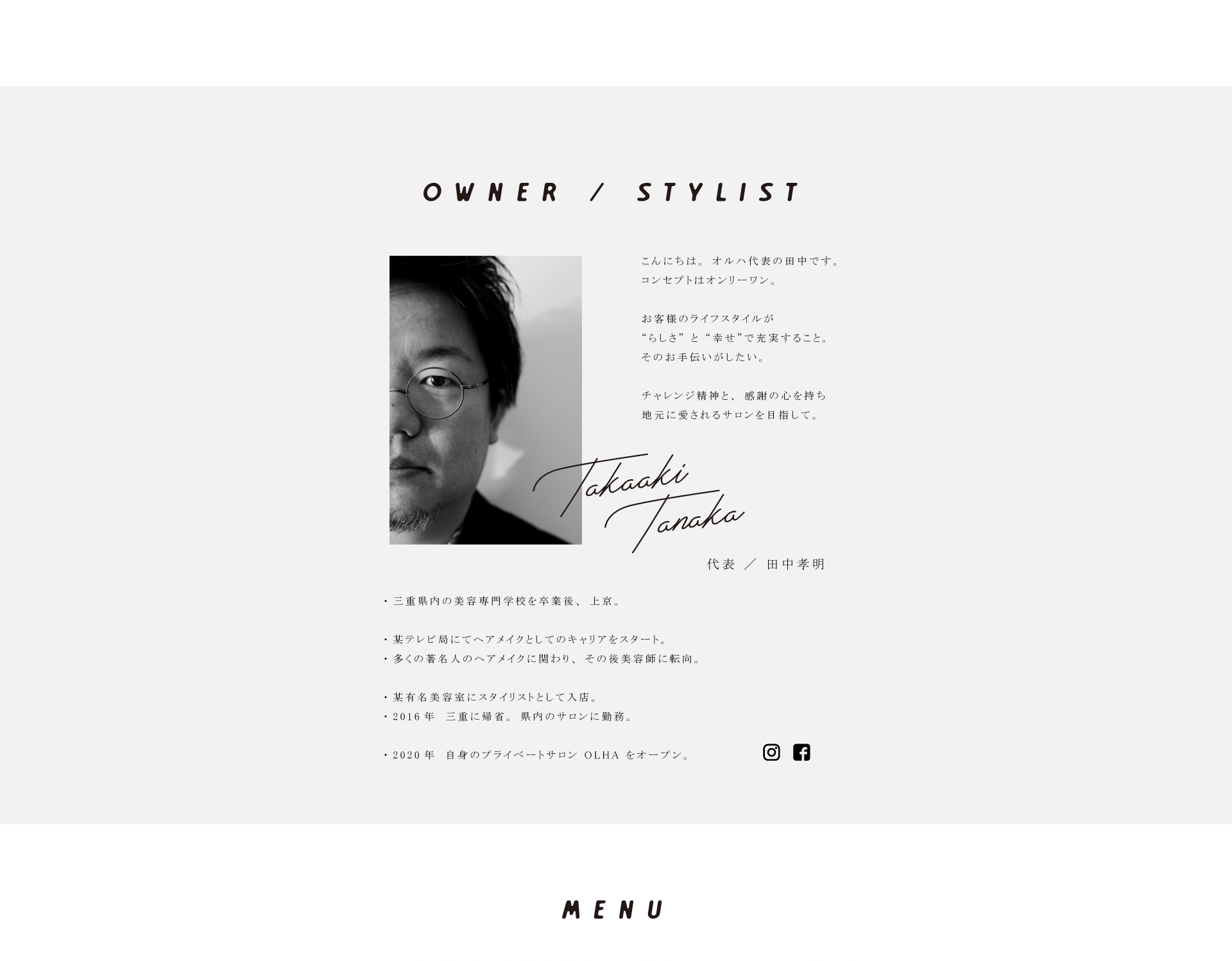 あなただけのオンリーワンなスタイルを。 オルハはお客様一人一人のオリジナリティを大切にし提案します。 OWNER / STYLIST 代表 / 田中孝明 こんにちは。オルハ代表の田中です。コンセプトはオンリーワン。 お客様のライフスタイルが“らしさ”と“幸せ”で充実すること。そのお手伝いがしたい。 チャレンジ精神と、感謝の心を持ち地元に愛されるサロンを目指して。 代表 / 田中孝明 三重県内の美容専門学校を卒業後、上京。 某テレビ局にてヘアメイクとしてのキャリアをスタート。 多くの著名人のヘアメイクに関わり、その後美容師に転向。 某有名美容室にスタイリストとして入店。 2016年 三重に帰省。県内のサロンに勤務。 2020年 自身のプライベートサロン OLHA をオープン。 BLOG 3月、4月のお知らせになります☘... 2026.02.25 本日2月25日(水)、明後日27... 2026.02.25 本日2月24日(火)、明日25日... 2026.02.24 本日2月21日(土)、明後日23... 2026.02.21 本日2月20日(金)、明日21日... 2026.02.20 2月17日(火)、明後日19日の... 2026.02.17 STYLE ACCESS OLHA only one hair (オルハ オンリーワンヘア) 〒515-2104 三重県松阪市小舟江町243−5 完全予約制 0598-30-6161